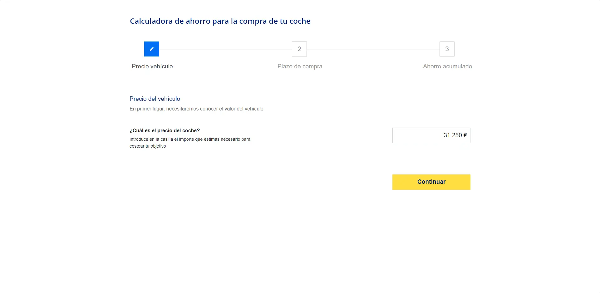 - ¿Cuál es el precio del coche? Introduce en la casilla el importe que estimas necesario para costear tu objetivo. Al igual que en la compra de una vivienda, la adquisición de un coche comporta una serie de gastos asociados que deberás tener en cuenta para no llevarte sorpresas posteriores (costes asociados a la financiación si te decantas por esta opción, seguro de auto -obligatorio-, impuestos, etc.).