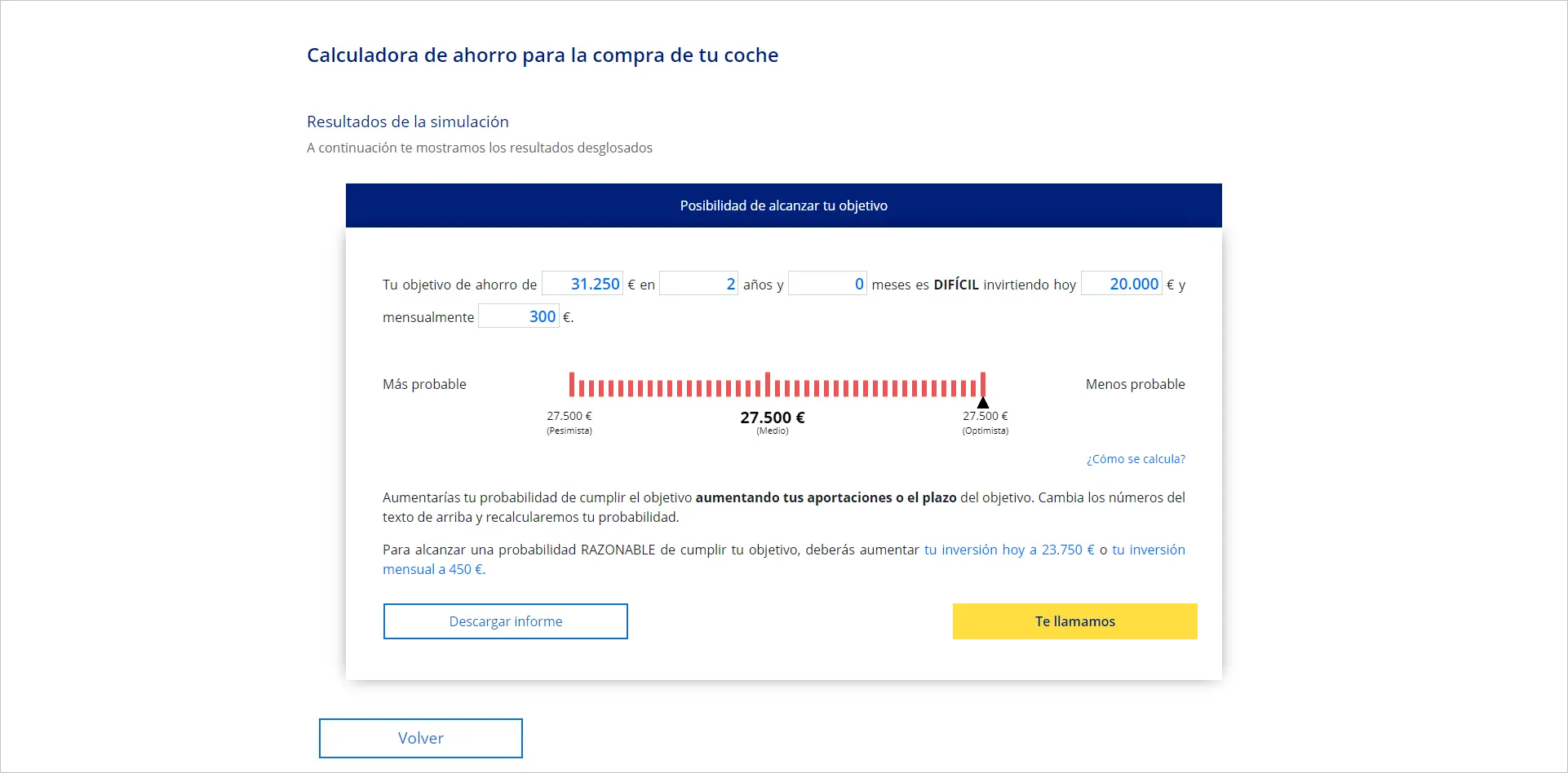 Una vez hayas completado todas las fases del proceso, te mostraremos los resultados personalizados de la simulación, con un completo desglose de la información. De esta forma sabrás la posibilidad de alcanzar tu objetivo.