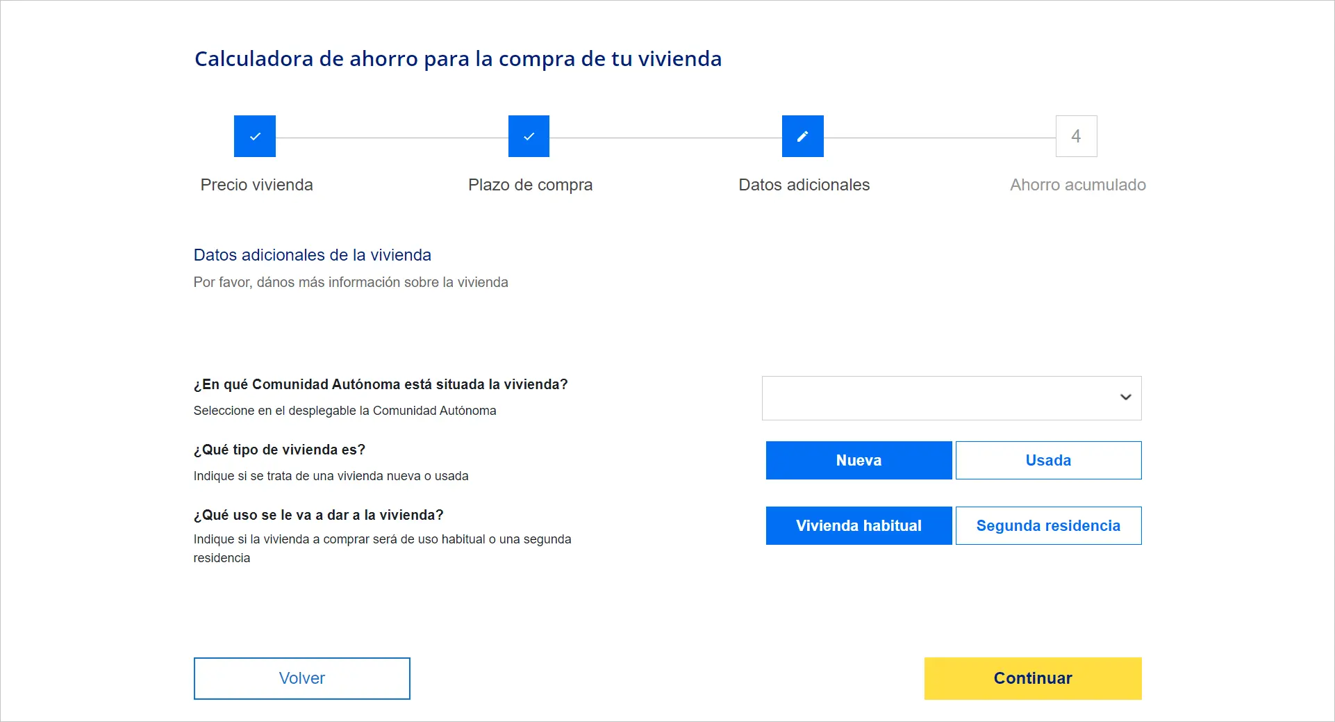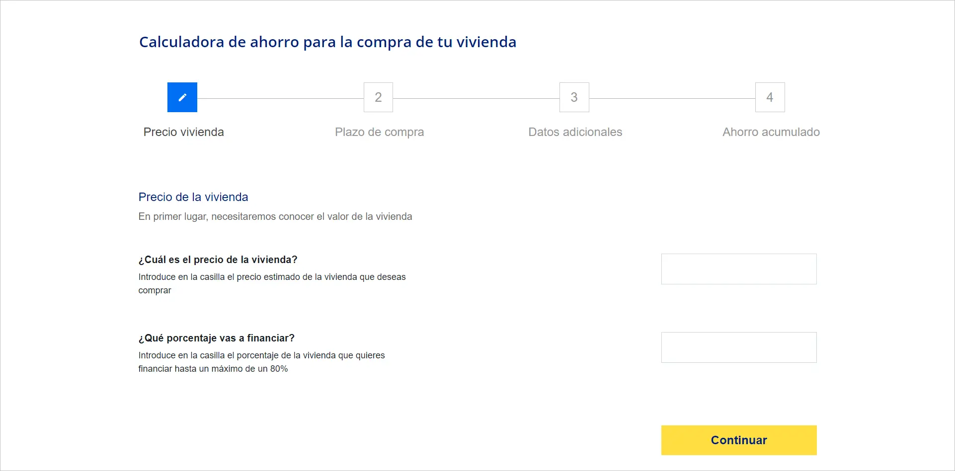 El proceso online para calcular el ahorro necesario para la adquisión de tu nueva vivienda es muy fácil e intuitivo, puesto que únicamente necesitarás aportar unos simples datos para realizar la estimación.