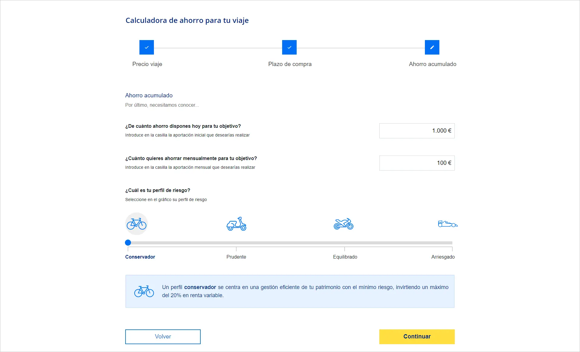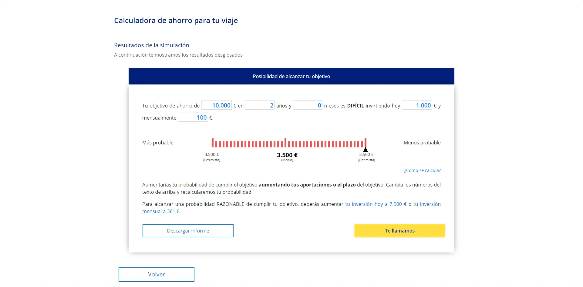 Puede darse el caso de que el resultado de tu planificación no cumpla tus expectativas. Por ello, de cara a lograr tu meta, la herramienta te propondrá dos alternativas: incrementar tus aportaciones o el plazo del objetivo.