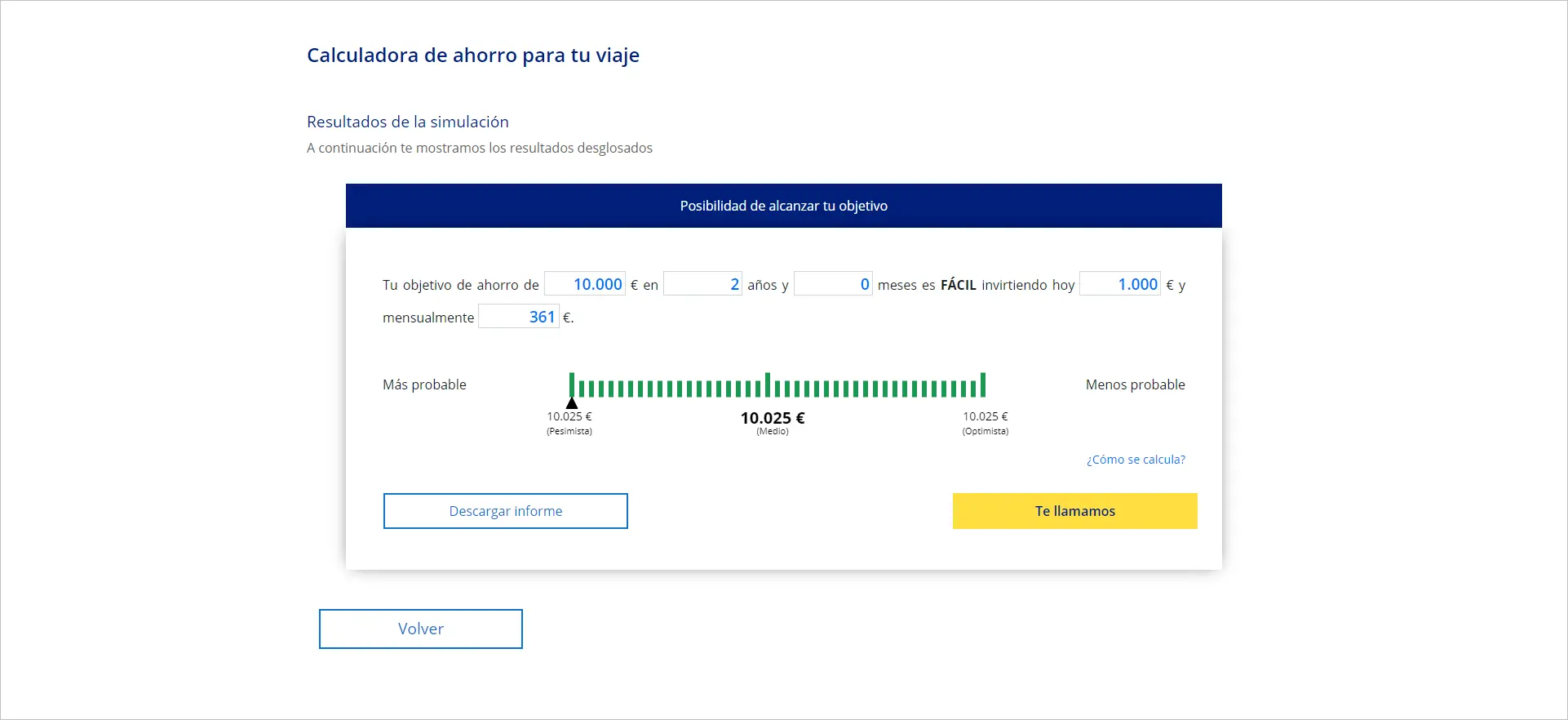 Al completar todas las fases del proceso, la herramienta te mostrará los resultados personalizados de la simulación, con un completo desglose de la información que incluye los cálculos oportunos para alcanzar la meta de ahorro aconsejado y cumplir tus objetivos.