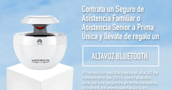 Por eso, en Santalucía, si contratas antes del 1 de diciembre del 2016 tu seguro Asistencia Familiar Plus, Asistencia Familiar premium o Asistencia Senior a Prima Única, te regalamos un Altavoz Bluethoot Huawei, para que puedas disfrutar de la música allá donde vayas.