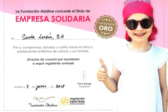 Desde hace años, La Fundación Aladina es una de las entidades que más apoyo recibe por parte de nuestros empleados en nuestro programa de acción social “Tú eliges a quién ayudamos”. Por ello, y gracias a nuestro compromiso con el cáncer infantil, la Fundación Aladina ha decido concedernos el título de “Empresa Solidaria” en la categoría ORO por “nuestro esfuerzo y cariño hacia los niños y adolescentes enfermos de cáncer y sus familias”.